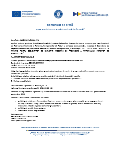 „PNRR: Fonduri pentru România modernă și reformată!” Beneficiar: PLEȘANU FLOAREA PFA Apel de proiecte gestionat de Ministerul Mediului, Apelor și Pădurilor, finanțat din fonduri europene prin Planul Național de Redresare și Reziliență al României, Componenta C2: Păduri și protecția biodiversității , Investiția 2. Dezvoltarea de capacități moderne de producere a materialului forestier de reproducere, Subinvestiția I.2.B. ”ACORDAREA DE SPRIJIN DE MINIMIS PENTRU DEZVOLTAREA DE CAPACITĂȚI MODERNE DE PRODUCERE A MATERIALULUI FORESTIER DE REPRODUCERE” Apel PNRR/2023/C2/S/I.2.B