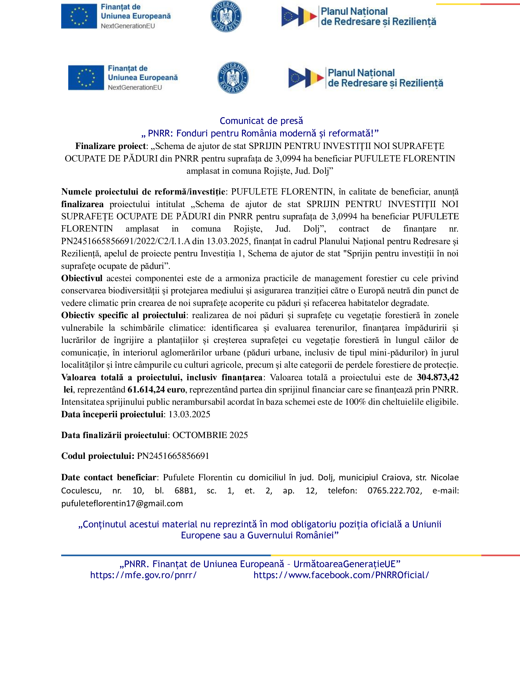Numele proiectului de reformă/investiție: PUFULETE FLORENTIN, în calitate de beneficiar, anunță finalizarea proiectului intitulat „Schema de ajutor de stat SPRIJIN PENTRU INVESTIȚII NOI SUPRAFEȚE OCUPATE DE PĂDURI din PNRR pentru suprafața de 3,0994 ha beneficiar PUFULETE FLORENTIN amplasat in comuna Rojiște, Jud. Dolj”, contract de finanțare nr. PN2451665856691/2022/C2/I.1.A din 13.03.2025, finanțat în cadrul Planului Național pentru Redresare și Reziliență, apelul de proiecte pentru Investiția 1, Schema de ajutor de stat „Sprijin pentru investiții în noi suprafeţe ocupate de păduri”.