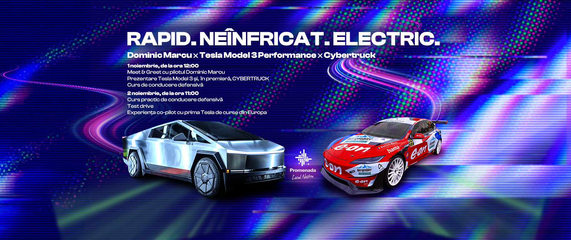 Craiova, 30 octombrie – Promenada Craiova găzduiește în perioada 1-2 noiembrie un eveniment spectaculos dedicat inovației și mobilității electrice, alături de pilotul de curse Dominic Marcu. Pentru al doilea an consecutiv, acesta revine la Craiova cu super activări marca Tesla, aducând în premieră impresionantul Cybertruck, susținut de Game World.