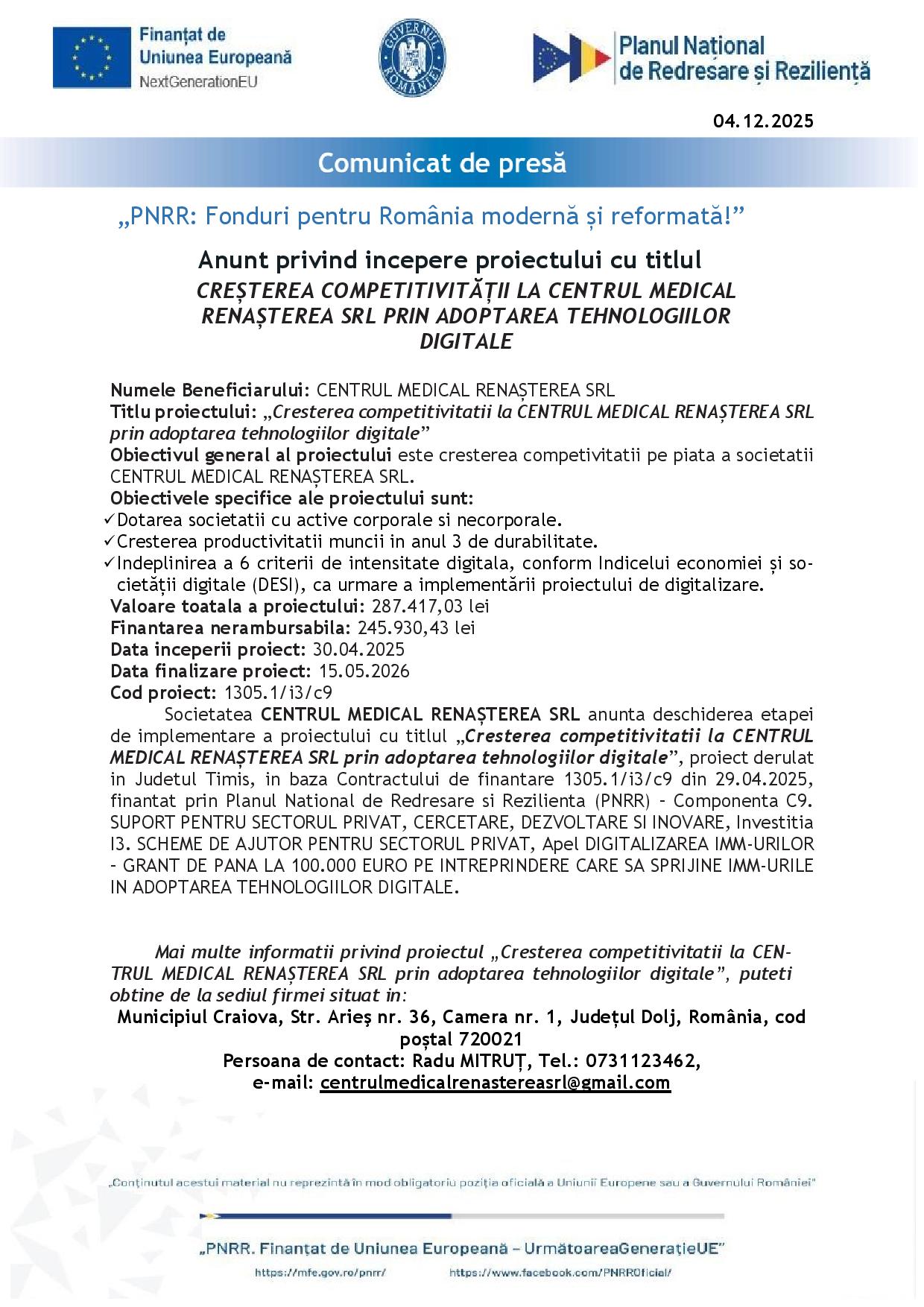 Societatea CENTRUL MEDICAL RENAȘTEREA SRL anunta deschiderea etapei de implementare a proiectului cu titlul „Cresterea competitivitatii la CENTRUL MEDICAL RENAȘTEREA SRL prin adoptarea tehnologiilor digitale”, proiect derulat in Judetul Timis, in baza Contractului de finantare 1305.1/i3/c9 din 29.04.2025, finantat prin Planul National de Redresare si Rezilienta (PNRR) – Componenta C9. SUPORT PENTRU SECTORUL PRIVAT, CERCETARE, DEZVOLTARE SI INOVARE, Investitia I3. SCHEME DE AJUTOR PENTRU SECTORUL PRIVAT, Apel DIGITALIZAREA IMM-URILOR – GRANT DE PANA LA 100.000 EURO PE INTREPRINDERE CARE SA SPRIJINE IMM-URILE IN ADOPTAREA TEHNOLOGIILOR DIGITALE.
