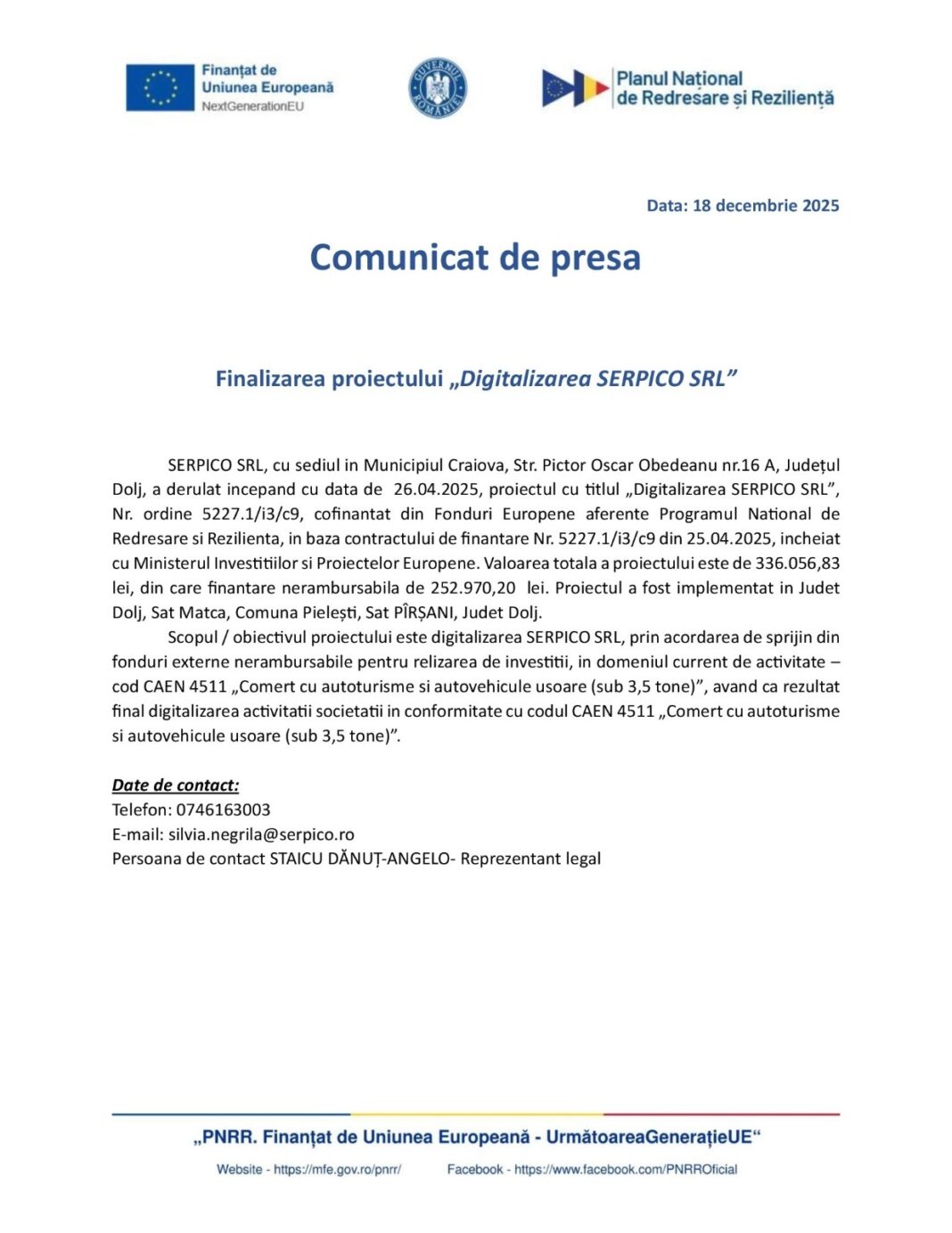 SERPICO SRL, cu sediul in Municipiul Craiova, Str. Pictor Oscar Obedeanu nr. 16 A, Județul Dolj, a derulat incepand cu data de 26.04.2025, proiectul cu titlul „Digitalizarea SERPICO SRL”, Nr. ordine 5227.1/i3/c9, cofinantat din Fonduri Europene aferente Programul National de Redresare si Rezilienta, in baza contractului de finantare Nr. 5227.1/i3/c9 din 25.04.2025, incheiat cu Ministerul Investitiilor si Proiectelor Europene. Valoarea totala a proiectului este de 336.056,83 lei, din care finantare nerambursabila de 252.970,20 lei. Proiectul a fost implementat in Judet Dolj, Sat Matca, Comuna Pieleşti, Sat PÎRŞANI, Judet Dolj.