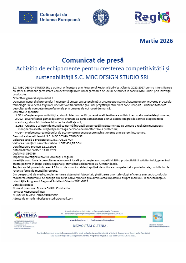 S.C. MBC DESIGN STUDIO SRL a obținut o finanțare prin Programul Regional Sud-Vest Oltenia 2021-2027 pentru intensificarea creșterii sustenabile și creșterea competitivității IMM-urilor și crearea de locuri de muncă în cadrul IMM-urilor, prin investiții productive.