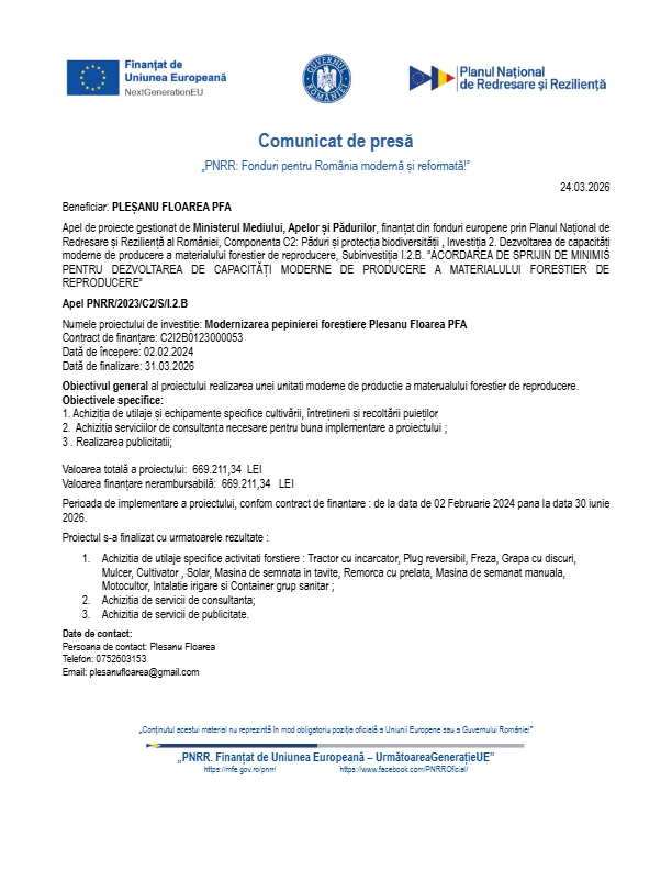 Apel de proiecte gestionat de Ministerul Mediului, Apelor și Pădurilor, finanțat din fonduri europene prin Planul Național de Redresare și Reziliență al României, Componenta C2: Păduri și protecția biodiversității , Investiția 2. Dezvoltarea de capacități moderne de producere a materialului forestier de reproducere, Subinvestiția I.2.B. ”ACORDAREA DE SPRIJIN DE MINIMIS PENTRU DEZVOLTAREA DE CAPACITĂȚI MODERNE DE PRODUCERE A MATERIALULUI FORESTIER DE
