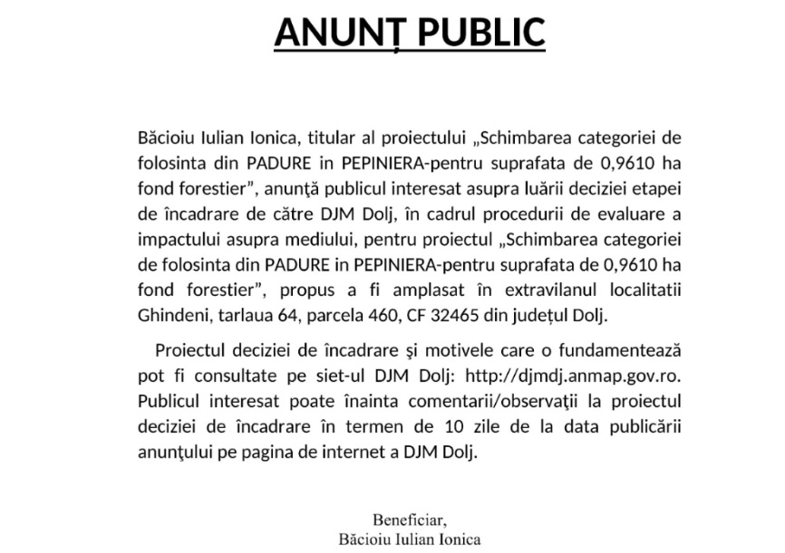 Băcioiu Iulian Ionica, titular al proiectului „Schimbarea categoriei de folosinta din PADURE in PEPINIERA-pentru suprafata de 0,9610 ha fond forestier”, anunţă publicul interesat asupra luării deciziei etapei de încadrare de către DJM Dolj, în cadrul procedurii de evaluare a impactului asupra mediului, pentru proiectul „Schimbarea categoriei de folosinta din PADURE in PEPINIERA-pentru suprafata de 0,9610 ha fond forestier”, propus a fi amplasat în extravilanul localitatii Ghindeni, tarlaua 64, parcela 460, CF 32465 din județul Dolj.