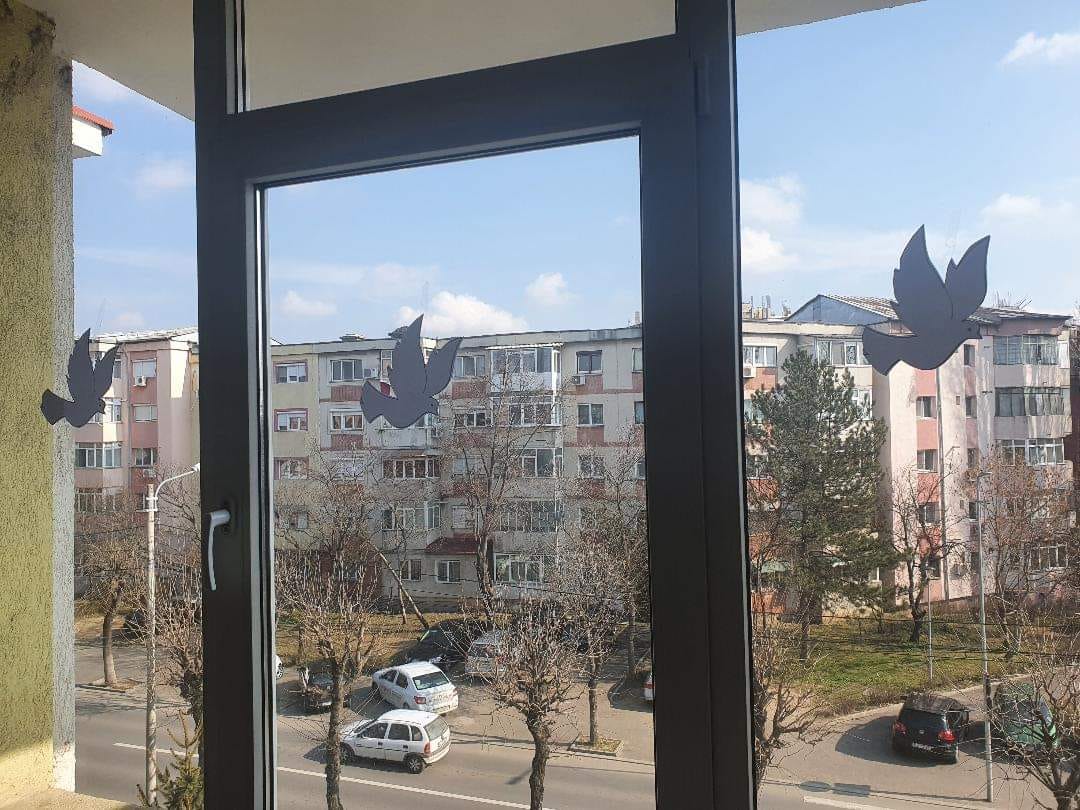 ”Dacă nu îi învățăm noi pe copii pacea, alții îi vor învăța violența.” Porumbelul cu ramura de măslin în cioc reprezintă un simbol al păcii în întreaga lume, transmit reprezentanţii Liceului Tehnologic ”George Bibescu”. Aceştia precizează că sursa de inspiraţie a fost gestul copiilor și al dascălilor Școlii Generale „Andrei Mureșanu” din municipiul Deva, care au împodobit gardul unității de învățământ astfel. Impresionaţi, elevii Liceului Tehnologic ”George Bibescu” Craiova au lipit, la rândul lor, pe geamurile școlii sute de porumbei albi, transmițând astfel un mesaj simbolic de pace și încetare a războiului.