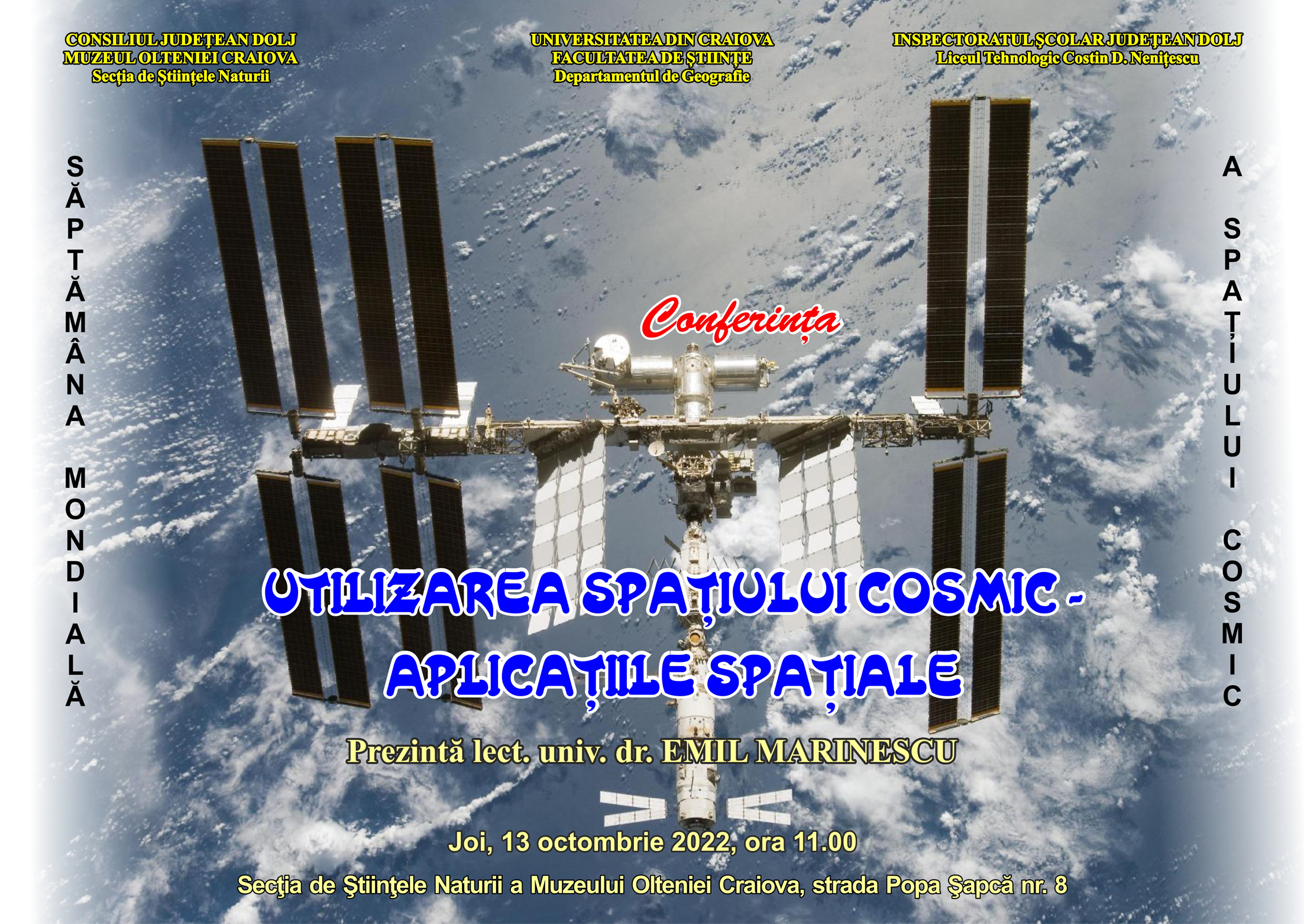 Secţia de Ştiinţele Naturii a Muzeului Olteniei Craiova continuă seria manifestărilor înscrise în cadrul proiectului cultural-educativ Mediul și Universul, cu prezentarea conferinței Utilizarea Utilizarea spaţiului cosmic – aplicaţiile spaţiale.
