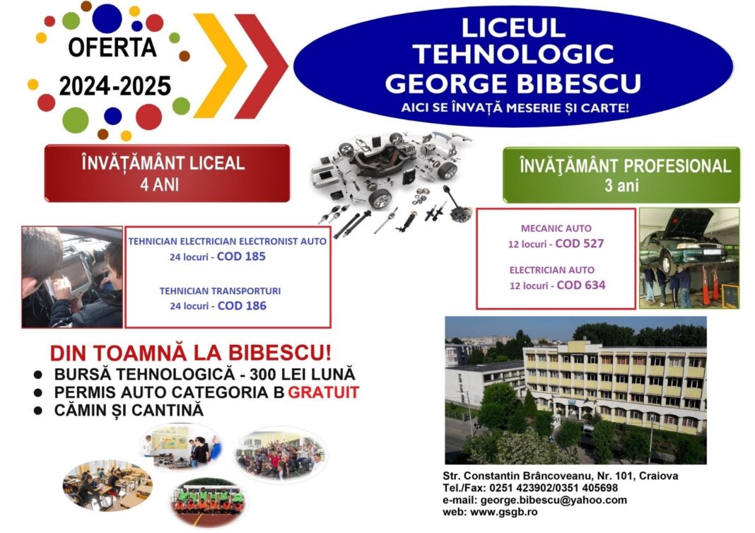 Liceul Tehnologic George Bibescu a publicat oferta educaţională pentru anul 2024-2025 Unitatea de învăţământ oferă mai multe facilități pentru elevi, de la condiții de cazare moderne și campus, la burse tehnologice sau permis de conducere.