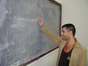 Toti cursantii au inceput de la liniute si bastonase, iar acum au ajuns la litera i. „I mare de tipar, i mic de tipar, in-da-ta, in-cet“, silabisesc cu greutate cei 13 cursanti ai grupei de maxima siguranta, in care invata cei condamnati la peste zece ani de detentie. Dupa citirea lectiei „Inotul“, din care aflam ca Dan este un inotator talentat, iar Miron si Diana abia asteapta sa intre in apa, detinutii sint invatati sa formeze propozitii cu noile cuvinte invatate. Toate acestea se intimpla in prima ora de curs. In cea de-a doua ora, invatatorul trece la o noua litera, pentru ca totul sa se incheie cu inspaimintatoarea dictare, cea care arata nivelul la care sint cursantii. Valentin B., invatatorul acestei grupe, are 64 de ani si 40 de ani de dascalit in spate. Acum este la pensie si s-a gindit ca un ban in plus nu strica nimanui. „Ca in oricare alta scoala, si aici sint elevi care invata bine si unii mai indaratnici“, aflam de la Valentin B. Condamnat la inchisoare pe viata, Gheorghe Dusan este unul dintre cei care se descurca foarte bine. Ii place sa invete, spune el.