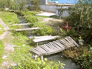 In plus, vecinii si-au construit cotete de porci pe cursul canalului, fapt care a dus la inundarea permanenta a cavourilor. Multe sint sparte si expun vederii sicriele care plutesc in apa verzuie si plina de broaste. Cei care nu arunca gunoiul aici din pura indolenta o fac constient si sirguincios, ca sa consolideze terenul mlastinos pentru ridicarea unui nou cavou. Reprezentantii parohiei au incercat in repetate rinduri sa curete locul in urma vecinilor, insa ceea ce se repara cu lopata in mina intr-o saptamina se distruge intr-o noapte. Unora dintre cei care au rude ingropate aici le este frica sa viziteze mormintele deja inghitite de stuf. Asta, desi s-a facut pirtie cu coasa printre buruienile inalte de-un stat de om.