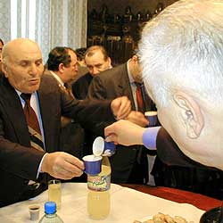 Lasind de-o parte apartenenta politica, mai-marii urbei si ai judetului si-au ciocnit cescutele – umplute doar pe jumatate, sa nu li se urce cumva la cap. Galant, primarul Vasile Bulucea a facut pe amfitrionul, turnind tuica – uneori chiar din propria ceasca – celor care si-au lichidat prea repede portia. Iar doamnelor a tinut sa le umple paharele cu vin, ca un veritabil chelner.