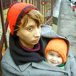 Mirela a muncit si ea o vreme: femeie de serviciu, matura prin blocuri. Dar de cind copiii se tin lant a trebuit sa se lase de serviciu. Cind saracia si-a scos coltii si n-a mai fost chip sa o scoata la capat nici macar cu mincarea si cu chiria, tinara s-a gindit ca poate face un ban si fara sa se desparta de mezina familiei. Intr-o zi a infasat-o si a plecat cu ea pe strazi, unde a vazut cu ochii. S-a oprit la usa bisericii si s-a asezat pe trepte, istovita. Primul banut asezat in palma ei de un trecator grabit a facut-o sa intrevada solutia. De atunci, vine zi de zi, fie ca e arsita, fie ca ploua, fie ca ninge viscolit.