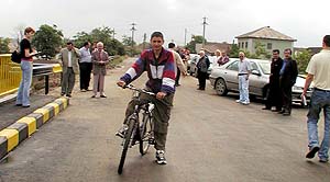 Panglicuta tricolora a fost taiata ieri, momentul a fost „palmuit“ anemic de vicele CJ, singurul care s-a gindit la aplauze, si toata lumea si-a atintit privirea in zare, asteptind primele masini care sa calce „in cauciucuri“ cele noua miliarde si patru sute de milioane cheltuite cu noul pod. Pedalind din greu si mijind ochii, nevenindu-i sa creada ca minunea s-a infaptuit, un biciclist asudat se apropia de cioporul de lume de la gura podului. Ametit de camerele de luat vederi si de prezenta zimbitoare a atitor domni in costum, Marin Mirica de-abia si-a continuat drumul spre Breasta, cu picioarele tremurind pe pedale. Masinile intirziau insa sa apara. Pina cind Marin Diaconeasa a avut o revelatie, s-a plesnit cu palma peste frunte si a exclamat: „Domne’, trimiteti pe cineva sa ia semnele alea de la capatul drumului, sa stie lumea ca s-a dat drumul la pod si nu mai trebuie sa ocoleasca!“.