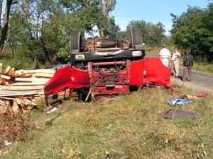Camionul a iesit de pe sosea si s-a rasturnat in paduricea de pe marginea drumului.