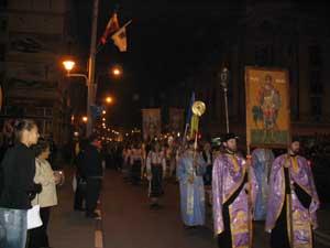 Inalt Prea Sfintia Sa Teofan Savu, Mitropolitul Olteniei, inconjurat de un sobor de arhierei, preoti si diaconi, a oficiat marti slujba vecerniei la Catedrala Mitropolitana „Sfintul Dumitru“ din Craiova. Dupa slujba, alaiul a pornit pe strazile orasului, intr-o procesiune cu sfintele moaste ale Sfintilor Nifon, Serghie, Vah si Sfintei Mucenite Tatiana. In acordurile fanfarei militare, mii de credinciosi, militari, maici, studenti, copii si virstnici s-au alaturat preotilor si impreuna timp de doua ore au strabatut principalele artere din centrul Craiovei.