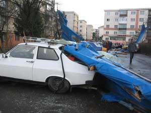 Peste 15 autoturisme au fost grav avariate in urma furtunii. Lemnele de constructie au patruns prin parbrizele si chiar plafoanele autoturismelor.