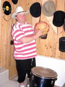 L-am gasit in „oaza de liniste“ pe care si-a construit-o singur, din amintiri, obiecte dragi si muzica. Privea un concert din Londra al lui Steve Vai. In jur, tobe, bongos-uri, darabane indiene, conga, castaniete, cowbell-uri, cinele, tom-tom-uri, vreo 30 de palarii din fetru, piele si pai – toate dupa modelul vitejilor din western-urile americane si primite in dar de la prieteni ori mirese carora le-a cântat de voie buna – câteva sute de CD-uri si alte zeci de DVD-uri cu muzica de toate genurile, din toate timpurile, aranjate intr-o camera amenajata special pentru relaxare, odihna, dar si repetitii.