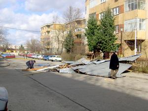 Table si lemne au zburat ieri, luate de vânt, in toate directiile, intre blocurile A 34 si A 27 din cartierul craiovean Brazda lui Novac, si in fata blocului M18, din cartierul 1 Mai, punând pe fuga trecatorii si personalul venit sa faca curatenie si avariind sase autovehicule. Daunele se ridica la peste 700 de milioane de lei vechi, dupa cum au apreciat reprezentantii municipalitatii si cei ai Politiei Rutiere, si vor fi suportate de cei gasiti vinovati pentru ca au efectuat si ingaduit lucrari neautorizate. Potrivit inspectorilor Primariei Craiova, acoperisul smuls de rafale de pe blocul A 34, din Asociatia de Proprietari nr. 26 Brazda lui Novac, purta marca Virgil Slotea, acelasi pretins constructor, de meserie patiser, care a ridicat si acoperisul de pe blocul A17, prabusit in primavara anului trecut. Slotea a lucrat fara autorizatie si fara proiect tehnic, fiind amendat in 2006 cu un miliard de lei vechi.