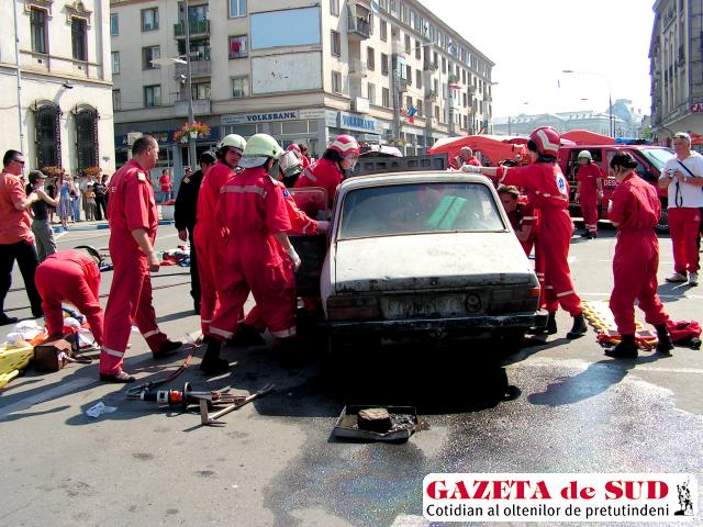 După un sfârşit de săptămână în care au fost solicitaţi să intervină la mai multe accidente de circulaţie, dintre care unul mortal, medicii din cadrul SMURD au organizat ieri un exerciţiu în centrul Craiovei.