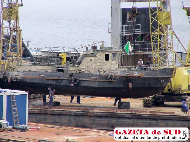 Nava Islaz, scufundată în urmă cu zece zile din cauza unei furtuni pe Dunăre, a fost scoasă la suprafaţă joi noapte. Ea se afla la 28 de metri adâncime şi se înfipsese în mâl. „Operaţiunea a fost periculoasă, dar am ţinut totul sub control chemând în ajutor o echipă de scafandri specialişti din Belgrad. A fost nevoie de un echipament special subacvatic de suflare a mâlului de pe fundul apei, pentru evitarea efectului de ventuză, care ar fi produs rupturi navei“, a declarat Viorel Pârcălăbescu, directorul SC Hidroconstrucţia SA Bucureşti, sucursala „Porţile de Fier“ Drobeta Turnu Severin.