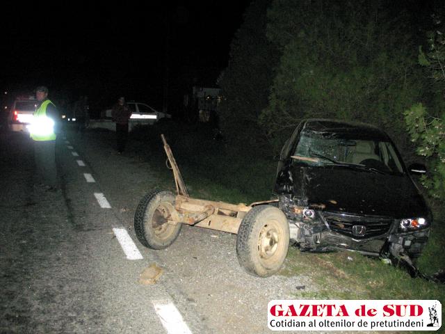 Două dintre roţile căruţei au rămas lângă autoturismul Honda Accord, cu numărul de înmatriculare DJ-11-MNC.