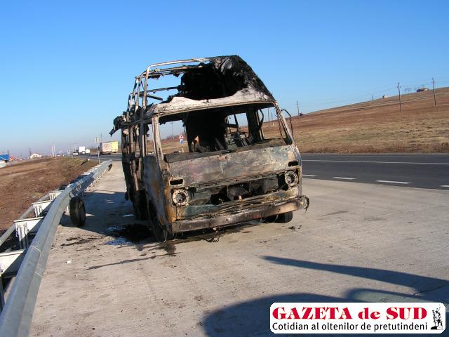 La ora 7.37, pompierii doljeni au fost solicitaţi să intervină la stingerea unui incendiu izbucnit la un microbuz care circula pe Centura de Nord din Craiova. Microbuzul cu numărul de înmatriculare B-CC-5336, condus de un cetăţean bulgar, a ars în întregime. „În acest caz, am stabilit că incendiul a fost provocat de un scurtcircuit la un conductor izolat necorespunzător“, a declarat locotenent Florin Cocoşilă, purtătorul de cuvânt al ISU Dolj. Din fericire, pasagerii microbuzului au scăpat nevătămaţi, reuşind să părăsească autovehiculul înainte să fie cuprins de flăcări.