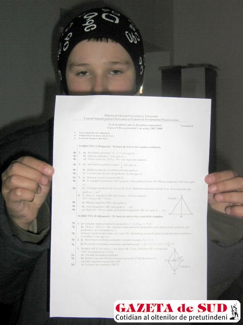 Mădălin este elev în clasa a VII-a la Şcoala Generală nr. 8 din municipiul Târgu Jiu. Subiectele de la teza la matematică i s-au părut uşoare: „Au fost uşoare subiectele, dar am greşit acolo unde nu mă aşteptam. Nu am stat în sală decât o oră şi jumătate, sper că am făcut de cel puţin nota opt. Vinerea viitoare voi da teza la limba şi literatura română. Mi-e cam frică, ar fi bine dacă ne-ar cădea rezumatul unui text la prima vedere. Mai am timp să învăţ“.