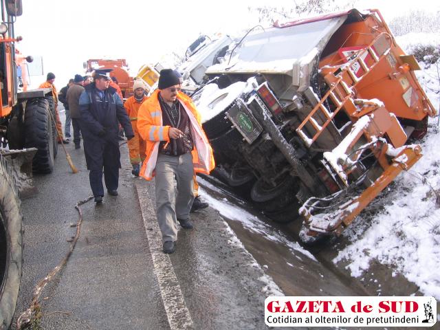 O autobasculantă ce aparţine SC Delta SA Bucureşti s-a răsturnat în şanţ în noaptea de joi spre vineri pe DE 70, în dreptul localităţii doljene Pieleşti. Utilajul împrăştia material antiderapant pe carosabil pentru ca ninsoarea să nu le creeze probleme şoferilor.