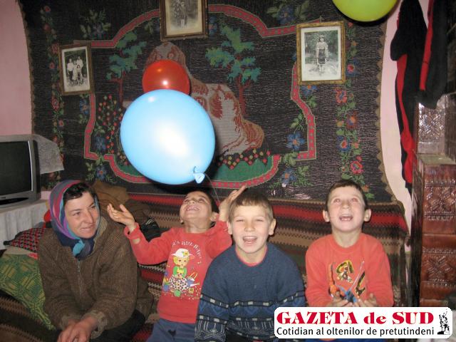 Băieţii erau supravegheaţi doar de mama lor, tatăl fiind plecat, după spusele lor, cu caprele pe islaz. Erau veseli, pentru că tocmai primiseră nişte baloane colorate de la mama lor. „Le-am primit rest de la magazin, când am cumpărat pâine“, a explicat Ştefania Neagoe. Femeia avea o mină de om necăjit şi tot încerca să ne spună cât de rău trăiesc din alocaţiile celor mici şi că nu există soluţii pentru o viaţă mai bună: „Trăim toţi din banii copiilor. Mihăiţă nu primeşte însă alocaţie pentru că am neglijat până acum să-i fac certificat de naştere. Şi nu ştiu unde să mă duc pentru certificat“. Nici alocaţia suplimentară nu a mai venit de trei luni. Femeia este revoltată şi spune că ar fi aflat de la poştaş că problema ar fi la Direcţia Muncii de la Craiova, iar ea nu se poate duce până acolo. Ştefania recunoaşte că nici soţul ei nu se prea descurcă: „Serviciu a avut într-o perioadă, la o firmă de construcţii din Craiova, dar nu a fost plătit şi nu s-a mai dus. Astă-vară a mai lucrat ca salahor pe la casele oamenilor, dar nu primea mai mult de 200.000 de lei pe zi. Iar acum, iarna, nu prea se mai găseşte de lucru“.