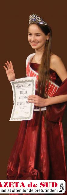 VÂLCEA. Ioana Lorena Stanciu şi Evelin Dicu, de la Liceul de Artă din Râmnicu Vâlcea, au câştigat la sfârşitul acestei săptămâni titlul Mini Miss România 2008. Ioana a fost selecţionată pentru categoria 12 – 15 ani şi Evelin la categoria nouă – 11 ani. În primăvara anului 2007, toţi copiii din ţară care au avut între cinci şi 15 ani au putut să se înscrie pentru Concursul Naţional Mini Miss România 2008, iar în decembrie 2007, după criterii drastice, 20 de participanţii au fost aleşi pentru finală. Finala Concursului Naţional Mini Miss sub sprijinul Unesco a avut loc la Palatul Copiilor din Bucureşti, pe 12 ianuarie 2008, iar judeţul nostru a fost reprezentat de cele două, Ioana Lorena Stanciu şi Evelin Dicu, iar Camelia Clavac a făcut parte din juriu. Alături de titlul Mini Miss România 2008, Ioana Stanciu a mai primit pentru prestaţia artistică şi o diplomă Unesco, pentru că a fost singura concurentă care a prezentat proba numărul unu cu costum şi cântec popular şi proba numărul doi cu o poezie compusă de ea şi o piesă la pian, restul concurenţilor au prezentat play-back. De asemenea, Evelin a câştigat din partea Fundaţiei Mini Miss România cel mai bun interpret pentru prima probă. De acum, Ioana Lorena Stanciu şi Evelin Dicu au promis să fie cele mai bune ambasadoare ale României şi ale judeţului Vâlcea.