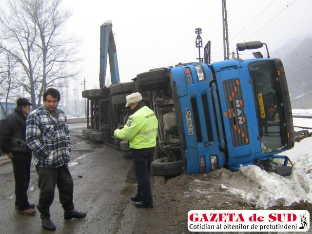 Din cauza poleiului, un tir încărcat cu 20 de tone de deşeuri din fier s-a răsturnat sâmbătă dimineaţă pe Drumul European 70, la ieşirea din municipiul Orşova.