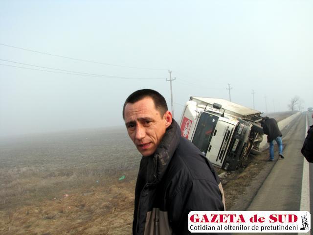 „Veneam de la Bucureşti. Transport 12 tone de condimente alimentare şi trebuia să ajung la Craiova. O maşină ce venea dinspre Slatina a intrat pe contrasens, dar nu ştiu ce a vrut şoferul să facă pentru că nu depăşea nici o maşină. Era ceaţă şi probabil că n-a văzut pe unde merge. Am virat dreapta brusc şi am intrat în şanţ, apoi m-am răsturnat. Nu sunt victime şi nici maşina nu este grav avariată. Aştept altă maşină ca să mutăm marfa, pentru a merge mai departe“, a spus conducătorul auto.