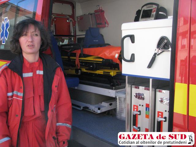 E ticsită de aparatură medicală. „Avem în ambulanţă tot ce există într-o cameră de resuscitare de la spital“, spune dr. Liliana Dăbuleanu, medic de urgenţă. E nevoie de o prezentare amănunţită, fiindcă ochiul neavizat se opreşte asupra tărgii din mijloc. „Targa aceasta este acţionată hidraulic, este deci mai performantă decât ce aveam înainte. În plus, accesul în ambulanţă se poate face atât prin spate, cât şi prin uşa laterală culisantă. Ne ajută foarte mult“, continuă medicul SMURD explicaţiile.