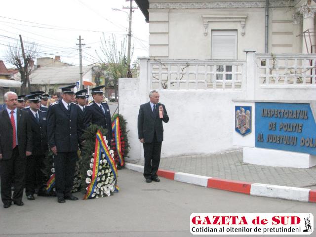 IPJ Dolj a marcat evenimentul aniversar printr-o festivitate care a debutat cu depuneri de coroane de flori la monumentul ridicat în cinstea eroilor-poliţişti, căzuţi la datorie. Instituţiile din fruntea judeţului şi municipiului, serviciile din cadrul inspectoratului, colegii jandarmi, poliţişti de frontieră, cei care asigură paza penitenciarelor sau reprezentanţii Brigăzii 2 Infanterie Uşoară „Rovine“ au transmis felicitările lor şi urările de bine cu ocazia Zilei Poliţiei Române. Au fost prezenţi la Craiova şi reprezentanţii Poliţiei oraşului Vidin din Bulgaria.