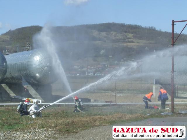 VÂLCEA. Aplicaţia a avut loc în interiorul parcului de rezervoare. Aici erau efectuate manevre de transvazare a unei cantităţi de GPL-aragaz dintr-o autocisternă într-un rezervor din zonă. Lucrătorul responsabil cu descărcarea din autocisternă a anunţat şeful de tură al depozitului de GPL că a izbucnit un incendiu la recipientul ce era golit, existând posibilitatea extinderii focului şi a producerii unei explozii.