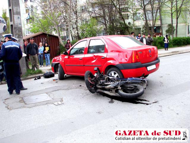 Sebastian şi Florian Jianu, de 52, respectiv 17 ani, din Craiova, se deplasau pe strada George Enescu pe o motocicletă Yamaha, când, la intersecţia cu strada Plevna, s-au ciocnit cu un Logan, condus de Daniel Cioc, de 30 de ani, tot din Craiova. Şoferul Daciei nu a oprit la stop, iar în urma impactului dintre cele două autovehicule, cei doi bărbaţi de pe motocicletă au fost răniţi. La faţa locului s-au deplasat trei maşini ale Serviciului de Ambulanţă Dolj. Sebastian Jianu a suferit răni grave, fiul său scăpând doar cu leziuni uşoare. Pe numele lui Daniel Cioc s-a întocmit dosar penal pentru vătămare corporală din culpă.