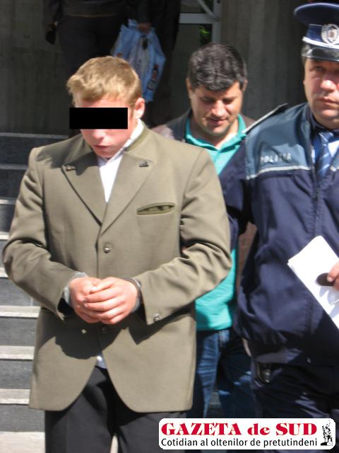 V.N.B. a fost adus ieri-dimineaţă la Parchetul de pe lângă Tribunalul Gorj, pentru a fi audiat. Minorul a fost prezentat apoi Tribunalului Gorj, cu propunere de arestare preventivă, şi s-a emis pe numele acestuia mandat pentru 29 de zile. El riscă o pedeapsă cu închisoarea de până la 25 de ani.