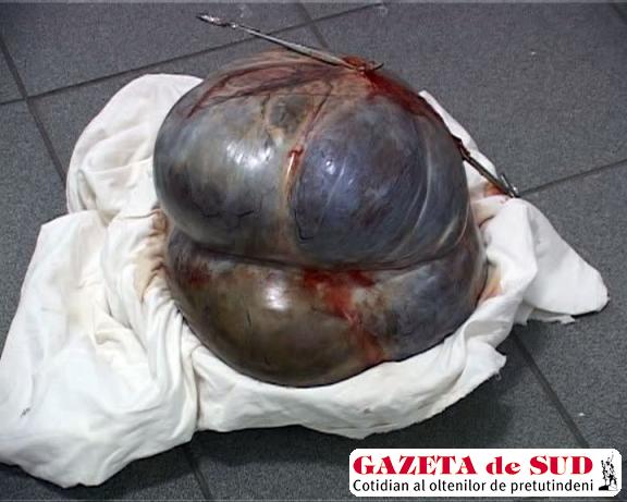 GORJ. Rodica Voinea este din comuna Târgu Logreşti, din judeţul Gorj. Acum un an, în urma efectuării unor analize la un spital din Craiova, femeia a aflat că are tumoare. Medicii au decis că singura şansă de salvare este operaţia, dar au amânat intervenţia chirurgicală, din cauza unor arsuri pe care bătrâna le-a suferit în zona abdominală. Ieri, Rodica Voinea a fost operată de o echipă formată din patru medici, condusă de dr. Adonis Bălan. Acesta a precizat că este cea mai mare tumoare pe care a văzut-o în toată cariera lui.