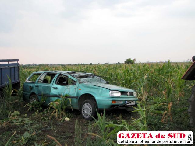 La un moment dat, roata din stânga-spate a autoturismului a cedat. Conducătorul auto, Traian Firoiu, a pierdut controlul volanului, autoturismul a părăsit şoseaua şi s-a răsturnat de trei ori în lanul de porumb.