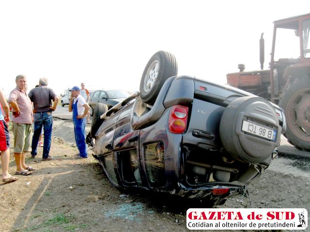 Poliţiştii doljeni au înregistrat ieri-dimineaţă două evenimente rutiere, dintre care unul grav. Primul s-a petrecut pe DJ 561, între localităţile doljene Ţuglui şi Calopăr. B.I., de 42 de ani, din Bucureşti, în timp ce conducea un Jeep Grand Cherokee, dinspre Craiova către Segarcea, s-a răsturnat în afara drumului, după ce una dintre roţile din spate ale maşinii s-a desprins. Din fericire, deşi maşina s-a făcut praf, şoferul a scăpat fără nici o zgârietură. Acesta a povestit că doar ce schimbase cauciucurile la o vulcanizare din Bucureşti şi, se pare, şuruburile roţii care s-a desprins nu au fost strânse bine de angajaţii respectivei vulcanizări. Bărbatul intenţionează să acţioneze în instanţă societatea care administrează vulcanizarea pentru recuperarea pagubelor.
