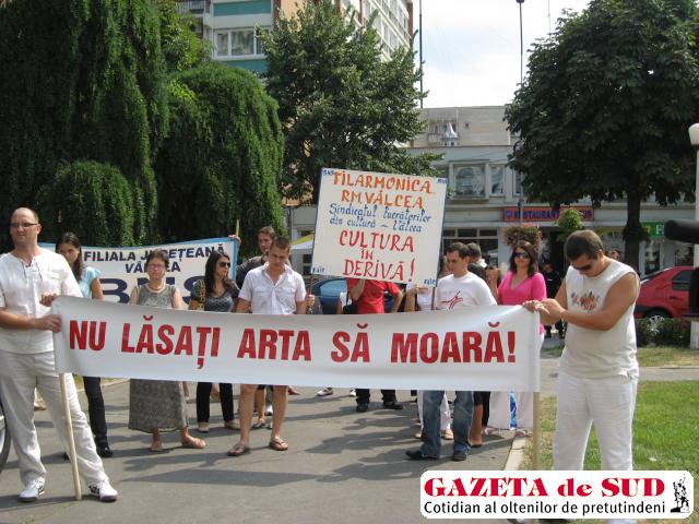 VÂLCEA. Aproximativ 30 de membri ai Sindicatului Lucrătorilor din Cultură Vâlcea au pichetat ieri sediul prefecturii, fiind nemulţumiţi de metodologia de aplicare a Legii nr. 353/2007. Oamenii au manifestat cu panouri inscripţionate cu „Nu lăsaţi arta să moară!“ şi „Cultura în derivă“. În acelaşi timp au avut loc manifestări în oraşele mari din toată ţara. „Anul trecut a fost scoasă Legea nr. 353/2007, care vizează cultura, şi a fost la început o lege bună. Noi am făcut mai multe propuneri la Ministerul Culturii, care vizau această lege, şi nu s-a luat nimic în considerare. Au ieşit acum normele de aplicare ale Legii nr. 353, care sunt un dezastru pentru cultură“, a declarat Victor Nemţeanu, liderul Sindicatului Lucrătorilor din Cultură Vâlcea. Acesta a susţinut că normele de aplicare încalcă Legea muncii, duc la reducerea personalului din instituţiile de spectacol, elimină sporurile şi vin cu sarcini suplimentare pentru personal. „În septembrie, vom face un miting de amploare la Bucureşti şi, dacă nu rezolvăm nimic, intrăm în grevă generală“, a susţinut Victor Nemţeanu. Participanţii la miting au înaintat plângerile prefectului Radu Renga, care le-a promis că o să le transmită la guvern.