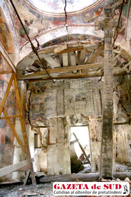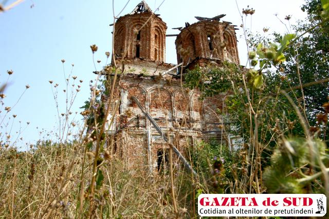 Pe întinderea aproape pustie, se mai vede lucrătură de om. Câţiva metri mai sus, pe o colină, ascunse de crengile copacilor, sunt două turle de biserică. Ce-a mai rămas din ea. E acolo din 1753. Legenda spune că Radu Ciobanul a avut un vis, în care Iisus Cristos i-a poruncit să ridice un locaş sfânt, chiar în locul acela. Dintr-un pom cu mai multe ramificaţii, bărbatul a cioplit câteva cruci. În faţa altarului, încă se vede crucea mare, plină de simboluri încrustate. Oamenii spun că, o vreme, în interiorul bisericii a curs un izvor cu apă tămăduitoare şi se strângeau bolnavii aici, să bea şi să se vindece. În ziduri, se desluşesc rămăşiţele din crucile de lemn de acum câteva sute de ani. Semne chirilice se observă în material. Cu ani în urmă, de Înălţare, spaţiul din jurul locaşului se umplea de credincioşi. „Mi-amintesc că mergeam cu bunica, când eram copil. Venea lume multă şi slujba se ţinea înăuntru. Într-o vreme, s-a încercat şi reabilitarea bisericii, dar apoi, Ceauşescu a desfiinţat Comisia monumentelor istorice, comuniştii au luat materiale şi le-au dus la CAP. Şi încet, încet, locaşul s-a degradat. Apoi familiile au plecat din Cruci. Acum mai vin credincioşii din Goieşti la Înălţare, la slujbă, că îşi au morţii îngropaţi aici“, povesteşte preotul comunei, Dumitru Staicu. Pe vreme bună, sătenii întind un cort în faţa bisericii. O improvizaţie din cărămizi aşezate una peste alta serveşte drept masă pentru Biblie.