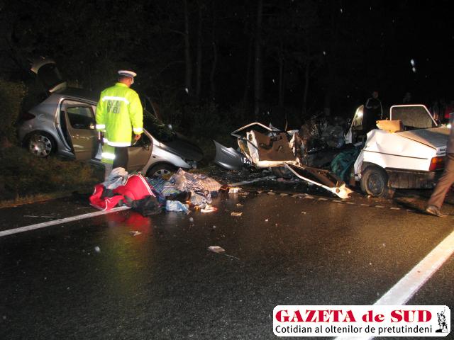 OLT. Un bărbat şi-a pierdut viaţa, iar alţi trei au fost răniţi, în urma unui grav accident de circulaţie petrecut la limita dintre judeţele Olt şi Argeş. Tragedia s-a produs duminică seară, în jurul orei 20.00. Gheorghe Oncescu, din oraşul Scorniceşti, se deplasa la volanul unui autoturism Dacia, dinspre Piteşti către Slatina. La un moment dat, el s-a angajat în depăşirea unei coloane de maşini. N-a apreciat însă distanţa faţă de autovehiculul care se apropia din faţă, spun poliţiştii, şi a intrat în coliziune cu acesta. Impactul a fost violent.
