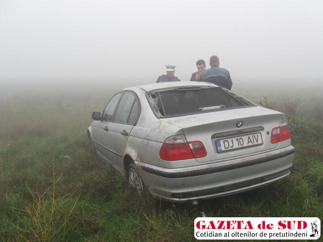 Un tânăr a fost transportat la spital ieri-dimineaţă, după ce a pierdut controlul autoturismului BMW pe care îl conducea pe centura de nord a Craiovei şi a părăsit partea carosabilă, oprindu-se pe câmp. Conform poliţiştilor doljeni de la Rutieră, Ionuţ Vasile, de 24 de ani, din Craiova, care conducea ieri, în jurul orei 9.00, BMW-ul cu numărul de înmatriculare DJ-10-AIV pe centura de nord, dinspre Balş către Filiaşi, a pierdut controlul direcţiei de mers, a părăsit partea carosabilă şi s-a oprit pe câmp, după ce a rulat aproximativ 50 de metri. În urma accidentului, autoturismul a fost avariat, iar şoferul a fost preluat de o ambulanţă SMURD şi transportat la Spitalul de Urgenţă Craiova, pentru acordarea îngrijirilor medicale. Tânărul a scăpat doar cu câteva zgârieturi. Poliţiştii de la rutieră au stabilit că accidentul s-a produs din cauză că şoferul nu a adaptat viteza la condiţiile de drum – ceaţă şi carosabil umed, deşi conducătorul auto a susţinut că a ieşit în decor, încercând să evite un autovehicul care venea din faţă, pe contrasens.