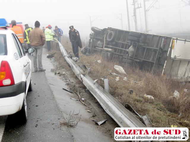 Un tir s-a făcut praf ieri-dimineaţă, pe DE 70, după ce s-a răsturnat în afara părţii carosabile. Conform poliţiştilor de la Rutieră care s-au deplasat la faţa locului, bărbatul nu a adaptat viteza în condiţii de carosabil umed şi, într-o curbă uşoară la stânga, la intrare pe pasarela CFR de la marginea comunei Coţofenii din Faţă, a pierdut controlul direcţiei, a mers peste parapetul de protecţie circa 50 de metri, după care s-a răsturnat în afara drumului. La faţa locului s-au deplasat o ambulanţă SMURD şi un echipaj de la Descarcerare, însă, din fericire, nu a fost nevoie de intervenţia lor, şoferul ieşind singur din tirul răsturnat. Poliţiştii de la Rutieră au precizat că acea porţiune de drum este periculoasă iarna, mai ales atunci când este acoperită cu polei, pentru că mulţi şoferi au tendinţa să apese pe acceleraţie la intrarea pe pasarelă.