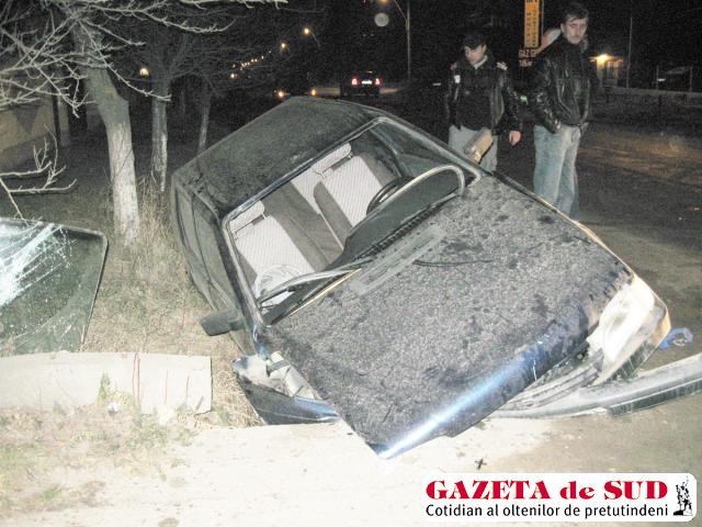 Alt eveniment rutier a fost înregistrat în jurul orei 19.00, în Craiova. Conform poliţiştilor de la Rutieră, Liviu Ioniţă, de 21 de ani, din localitate, care conducea o Dacie Super Nova, pe strada Bariera Vâlcii, a pierdut controlul direcţiei, a intrat în şanţul de pe marginea drumului, după care a lovit violent un cap de pod. Tânărul le-a explicat agenţilor de la Rutieră că a intrat în şanţ încercând să evite doi câini apăruţi pe şosea, dar poliţiştii au stabilit că accidentul s-a produs din cauza neadaptării vitezei la condiţiile de drum – carosabil umed. Tânăra care ocupa locul din dreapta-faţă în Dacia condusă de Liviu Ioniţă a suferit răni uşoare şi a fost transportată la Spitalul de Urgenţă Craiova.