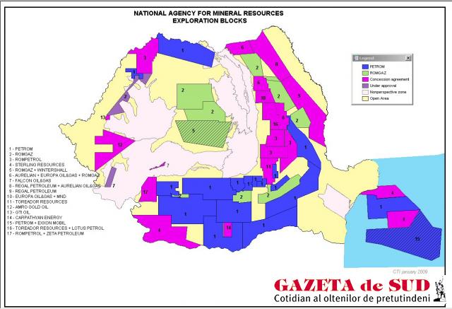 Sterling Resources Ltd., compania care se află în aceste zile în centrul scandalului privind perimetrele concesionate la Marea Neagră, efectuează cercetări şi prospecţiuni şi în zona Craiova Sud – unde a concesionat de la Agenţia Naţională pentru Resurse Minerale (ANMR) un perimetru de 1,5 milioane de acri (7.200 de kilometri pătraţi). Potrivit datelor prezentate de companie, canadienii au concesionat zona Craiova Sud în august 2000, când şi-au deschis filială în România. Cercetările desfăşurate până în prezent nu au dus la descoperirea de rezerve importante. În 2005, Sterling Resources a desfăşurat cercetări în zona localităţilor Cetăţuia şi Piscu Sadovei, fără rezultate notabile. În schimb, s-au descoperit două rezerve care ar putea avea potenţial. În ciuda rezultatelor dezamăgitoare, Sterling consideră că acest perimetru este încă insuficient explorat şi are un potenţial semnificativ. De asemenea, în 2007, compania a făcut teste în centrul perimetrului concesionat şi au fost identificate câteva locaţii pentru prospecţiuni privind existenţa unor zăcăminte de gaze. În august 2008, Sterling a făcut o înţelegere cu Grove Energy Romania, care a cumpărat alte 40% din Craiova Sud, iar ulterior a cedat TransAtlantic Petroleum Corporation 50% din lucrările de explorare. TransAtlantic are operaţiuni în Canada, SUA, Nigeria şi Benin. Potrivit ANRM, cea mai mare parte a perimetrelor disponibile în judeţul Dolj sunt concesionate de Sterling Resources şi Petrom SA. De altfel, Petrom SA are în exploatare nouă din cele 48 de zăcăminte din Oltenia.