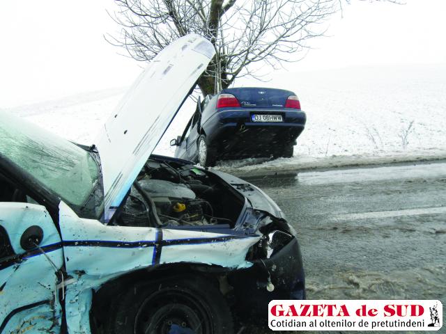Cinci persoane au fost rănite ieri-dimineaţă pe DN6, în apropiere de localitatea doljeană Zănoaga, după ce maşinile cu care se deplasau s-au tamponat violent. Poliţiştii din cadrul Biroului Poliţiei Rutiere Craiova au stabilit că Gheorghe Totolin, de 38 de ani, din localitatea Târgu Jiu, care conducea o Dacia Logan dinspre Caracal către Craiova, în afara comunei Zănoaga, a derapat, a pătruns pe contrasens, unde s-a izbit de un Cielo condus regumentar din sens invers de Doru Mitrică, de 41 de ani, din Zănoaga. În urma impactului puternic, autoturismul Cielo a fost proiectat într-un copac de pe marginea drumului. La faţa locului au ajuns mai multe ambulanţe, care i-au transportat la Spitalul de Urgenţă Craiova pe cei doi şoferi, unde s-a stabilit că Mitrică a suferit un traumatism cranio-facial şi mai multe excoriaţii. Rănit grav a fost şi Petrică Nicoleasa, pasager în Logan, acesta suferind un traumatism cranio-cerebral mediu. Şoferul Loganului şi alţi doi pasageri din autoturism au fost răniţi uşor, nefiind necesară transportarea lor la spital. Poliţiştii au stabilit că responsabil de producerea accidentului este şoferul Loganului, care nu a adaptat viteza la condiţiile de drum – acoperit cu mâzgă.IN