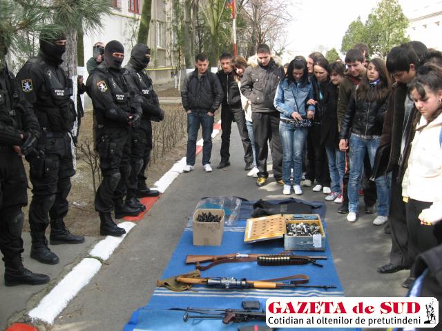 Zeci de elevi de clasele a IX-a şi a XI-a de la Liceul „Traian Vuia“ din Craiova au profitat ieri de Ziua Porţilor Deschise la Inspectoratul de Poliţie al Judeţului (IPJ) Dolj, pentru a cunoaşte amănunţit ce înseamnă meseria de poliţist. Nici n-au intrat bine în curtea instituţiei, că i-au luat în primire mascaţii Departamentului Poliţiei de Intervenţie Rapidă (DPIR).