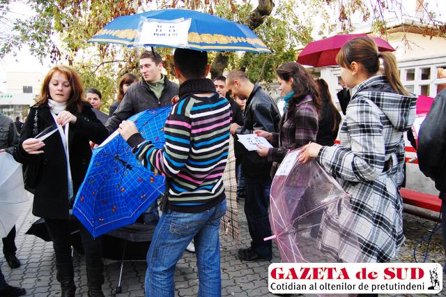 Asociaţia Studenţilor Basarabeni din Craiova a organizat ieri un miting de protest în faţa Oficiului pentru Imigrări. Având drept slogan „Nu vă faceţi că plouă“, acţiunea studenţilor basarabeni din Craiova a fost repetată şi în Bucureşti, Timişoara, Galaţi, Iaşi, în oraşe cu centre mari universitare, tinerii protestând împotriva deciziei autorităţilor române, care au introdus o taxă de şedere consulară de 120 euro/an pentru basarabeni.