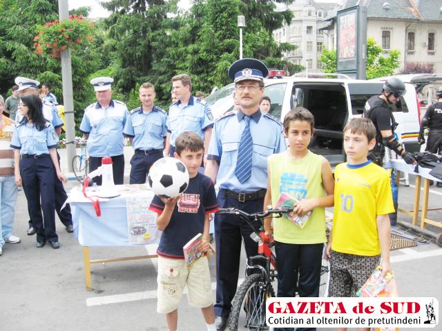 Poliţiştii craioveni de la Secţia 2 au organizat ieri, în faţa primăriei, un concurs de biciclete destinat elevilor din ciclul primar. La această acţiune, dedicată Zilei Copilului şi derulată în colaborare cu ONG-ul „Tinerii luptă împotriva viciilor mileniului III“, au luat parte 19 elevi de clasa a II-a şi a IV-a de la şase şcoli din Craiova. Concurenţii au dat mai întâi o probă teoretică, pe care au promovat-o toţi, trecând apoi la proba practică, de conducere a bicicletei într-un poligon sinuos. După o luptă strânsă cu cronometrul şi o departajare în funcţie de numărul jaloanelor doborâte, au fost desemnaţi câştigătorii. Primul loc l-a obţinut Mihai Nebeja, de la Şcoala nr. 14, care a primit drept premiu o bicicletă performantă. Cadoul s-a dovedit inspirat, deoarece băiatului i se stricase bicicleta chiar în acea dimineaţă, fiind nevoit să concureze pe bicicleta unui prieten. Locul al doilea l-a ocupat Daniel Grecu, de la Şcoala nr. 30, premiat cu o pereche de role, iar al treilea ocupant al podiumului, Cristian Irimia, tot de la Şcoala nr. 14, a primit o minge de fotbal. Ceilalţi concurenţi au primit cărţi, pliante, diplome de participare, dar şi câte un „permis de biciclist“, special emis de poliţie pentru această ocazie.